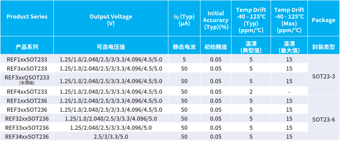 致力于提供高品质芯片的国内优秀模拟及数模混合芯片设计商上海类比半导体技术有限公司(下称“类比半导体”或“类比”)宣布推出REF1xx/3xx/4xx系列低温漂、高性能、微功耗、小封装的电压基准源。该系列产品的初始精度达到0.05%并具有优异的温度漂移性能表现, REF1xx和REF3xx系列产品温漂典型值为5ppm/°C,最大值为15ppm/°C,高性能REF4xx系列的温漂典型值更是达到了2ppm/°C的极致表现。REF1xx/3xx/4xx电压基准源的工作温度为-40~125℃,广泛适用于工业、光伏、汽车、医疗等领域,其中REF3xx作为通用产品,提供支持AEC-Q100的车规级版本,为严苛的汽车应用场景提供出色的性能。