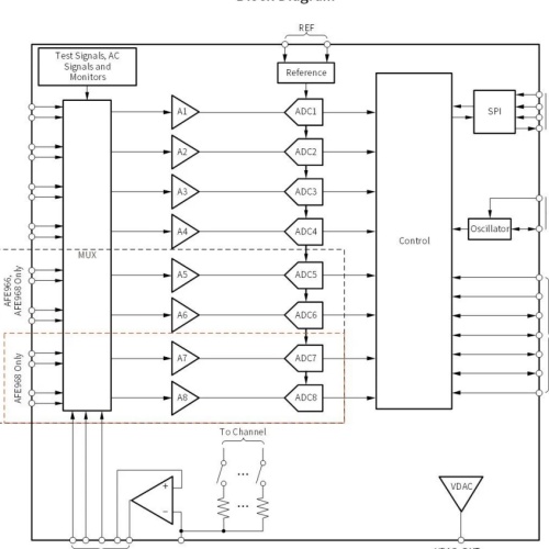 产品概述:AFE96x系列包括AFE964、AFE966和AFE968三款器件,分别是四通道、六通道和八通道低噪声、24位同步采样Δ-Σ模数转换器(ADC)系列产品。该系列产品内置可编程增益放大器(PGA)、三种可配置内部基准以及板载振荡器,具备出色的性能表现。