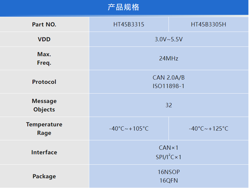 HOLTEK新推出的HT45B3315 CAN Bus Controller是一款在CAN总线通信领域具有重要应用价值的控制器。以下是关于它的一些特点和优势: