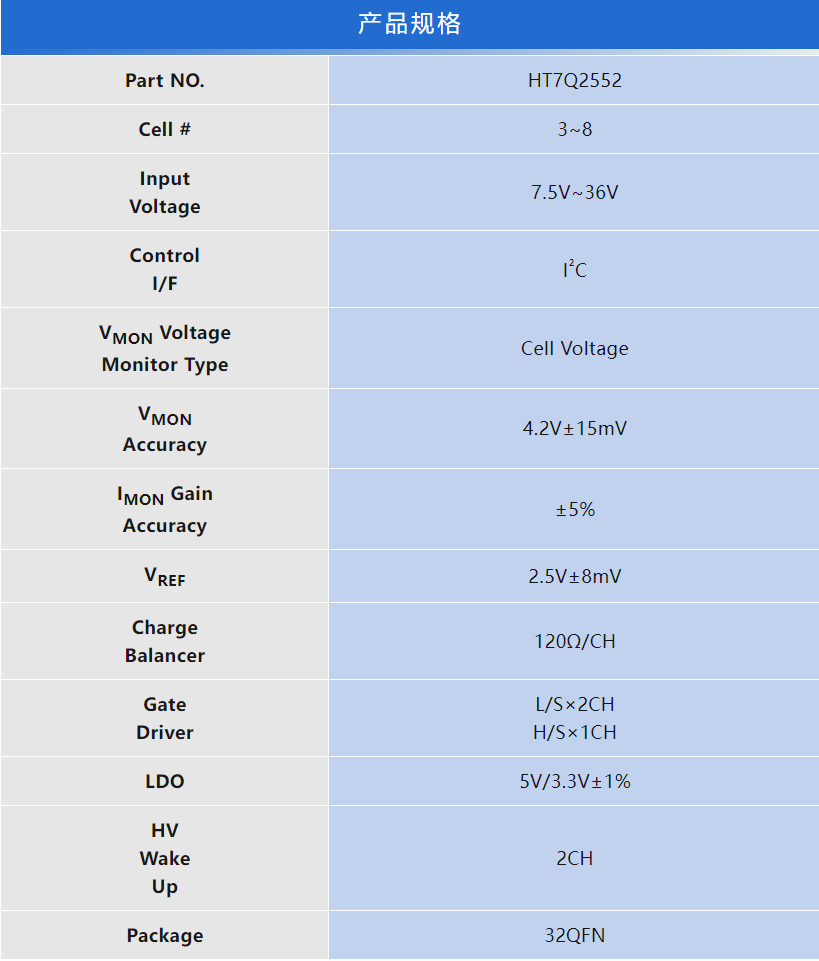 HOLTEK新推出的HT7Q2552是一款支持8节锂电池保护的模拟前端IC,具有以下特点: