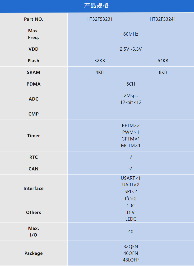 HOLTEK新推出的HT32F53231/41/42/52 5V CAN宽电压32-bit MCU具有以下特点: